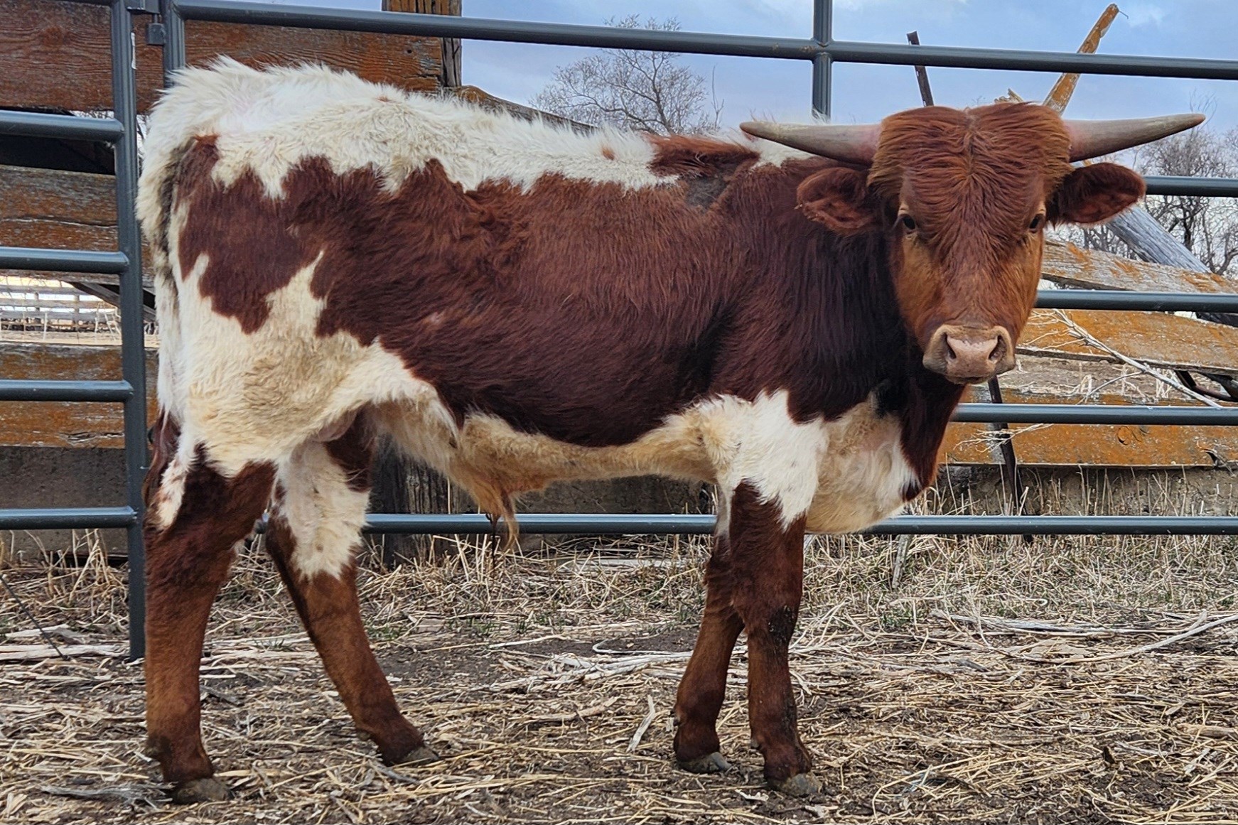 Available as freezer filler. He has busted off his right horn. Sells at $2.25 per pound live weight.