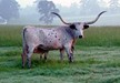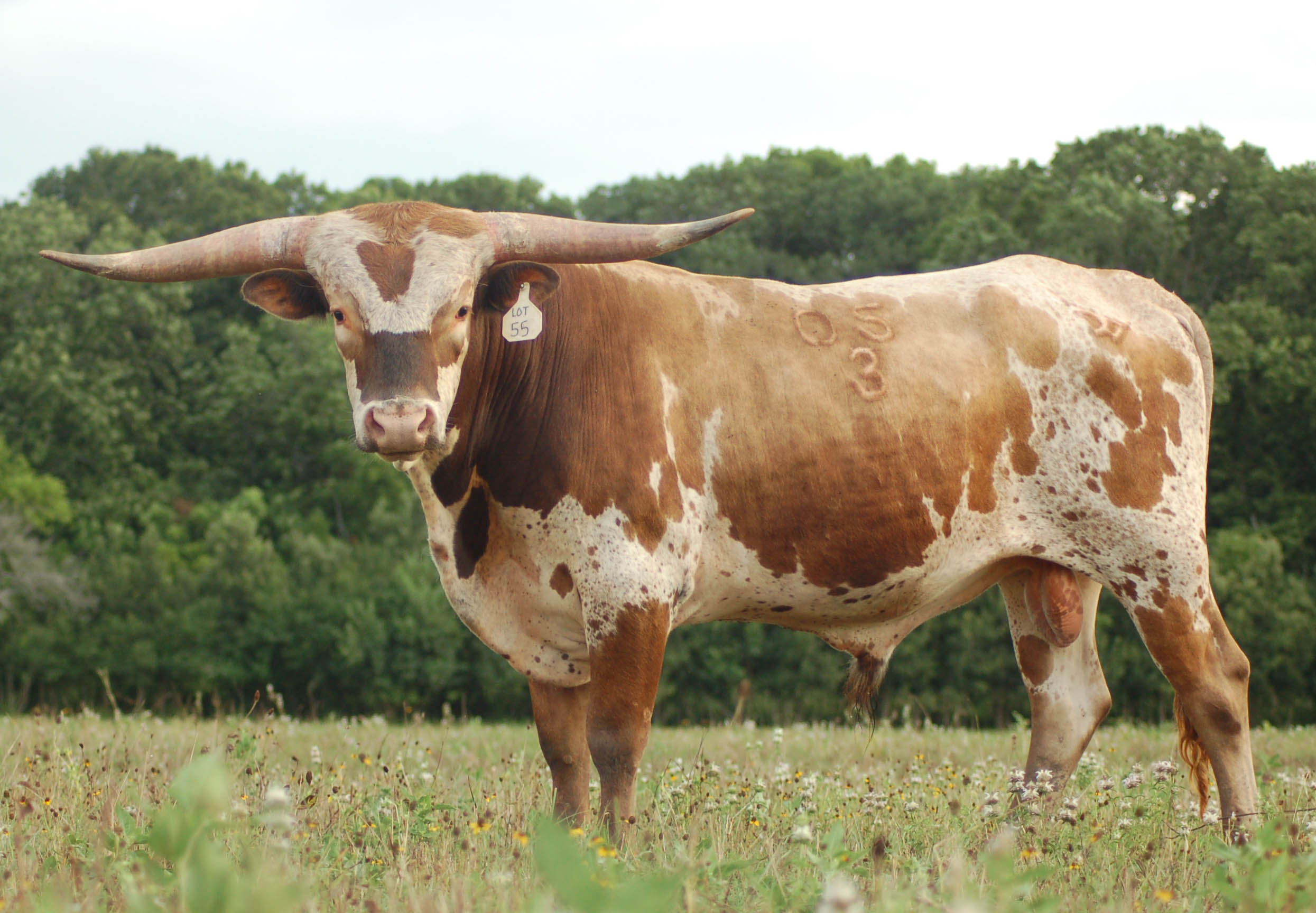 Mojo Man daughters have been easy to sell. He is a very complete bull and produces very consistent calves. His offspring have been heavy based, lateral horned cattle. Mojo Man missed first place in his class by 1/2 point at the Millineum Futurity. The Boomerang/G-Man cross certainly works here. His sire, Outback Mojo, is another one of the great Boomerang sons. His dam, GF Elena, is a super producer and has proven herself as one of the elite cows in our breed. We have had good success breeding him to our J.R. Seman daughters. He is very correct, muscular and colorful. He puts very big based, lateral horn growth in his calves. We are very pleased with this bull. 69" TTT. SOLD!